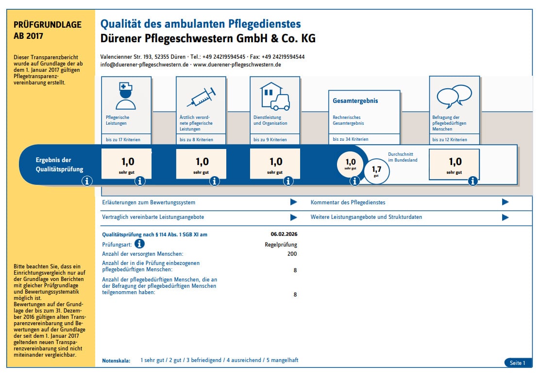 Transparenz und Qualität sind uns besonders wichtig. Deshalb stellen wir Ihnen hier den Transparenzbericht des MD (Medizinischer Dienst Nordrhein) unseres Pflegedienstes zu Verfügung. Der Bericht gibt Ihnen einen detaillierten Einblick in die Qualität unserer Pflegeleistungen und zeigt, wie wir kontinuierlich an der Verbesserung unserer Standards arbeiten. Wir sind stolz darauf, dass der Medizinischer Dienst unseren Pflegedienst nach höchsten Standards bewertet hat.
